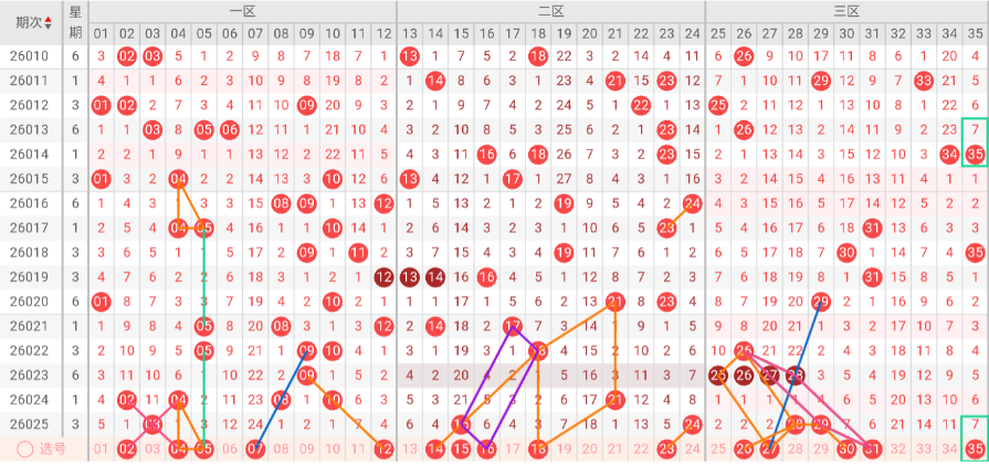 该区间在经历断区后,逐步回暖,上期回到2码。呈现出明显的V型反转或对称特征:从2码跌至断区,再逐步回升至2码。这种走势表明二区在经历了一次深度回调后,正在稳步恢复热度。连续两期的出号递增,构成了一个清晰的爬坡形态。本期延续这一趋势,继续维持在2码左右的概率较大。推荐关注号码:14、15、16、18、23。