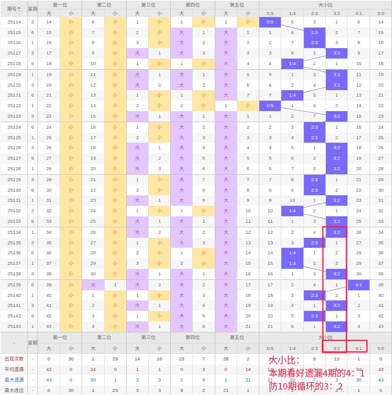 上期大小比:3:2,近10期大小比出现情况:3:2、2:3、1:4、1:4、3:2、4:1、2:3、3:2、2:3、3:2,最近10期出现4期3:2,出现3期2:3,出现1期4:1,出现2期1:4,出现0期5:0,出现0期0:5,根据近10期规律本期看好遗漏4期的4:1,防10期循环的3:2,综上所述推荐大小比推荐:3:2,重点关注:4:1。