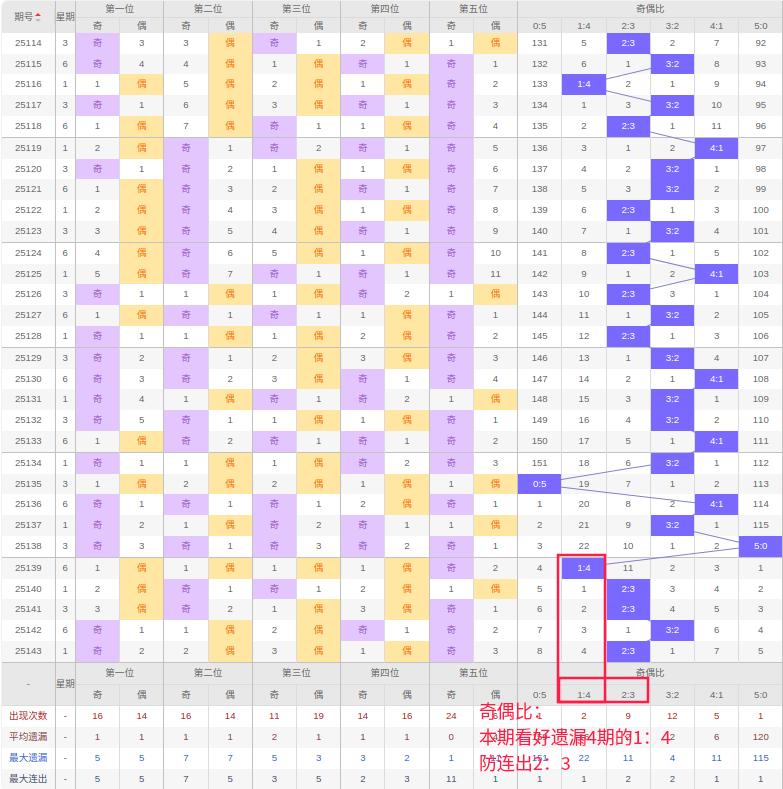 上期奇偶比:2:3,近10期奇偶比出现情况:3:2、0:5、4:1、3:2、5:0、1:4、2:3、2:3、3:2、2:3,最近10期出现3期3:2,出现3期2:3,出现1期4:1,出现1期1:4,出现1期5:0,出现1期0:5,根据近10期规律本期看好遗漏4期的1:4,防连出2:3,综上所述推荐奇偶比推荐:2:3,重点关注:1:4。
