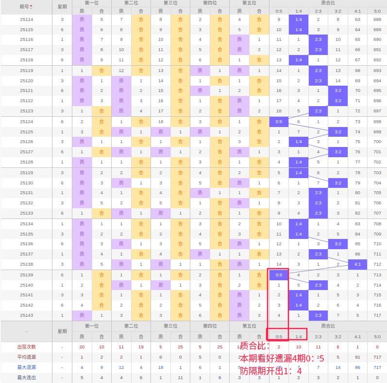 上期质合比:2:3,近10期质合比出现情况:1:4、1:4、3:2、2:3、4:1、0:5、2:3、1:4、1:4、2:3,最近10期出现1期3:2,出现3期2:3,出现1期4:1,出现4期1:4,出现0期5:0,出现1期0:5,根据近10期规律本期看好遗漏4期的0:5,防隔期开出1:4,综上所述推荐质合比推荐:1:4,重点关注:0:5。