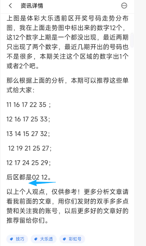 上图是上期体彩大乐透分析文章的截图,最后我推荐的单式中后区两码定02 12,开出的后区是01 12。这个你们上期文章看看吧。