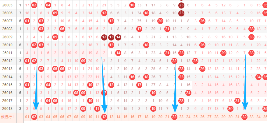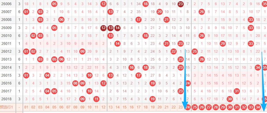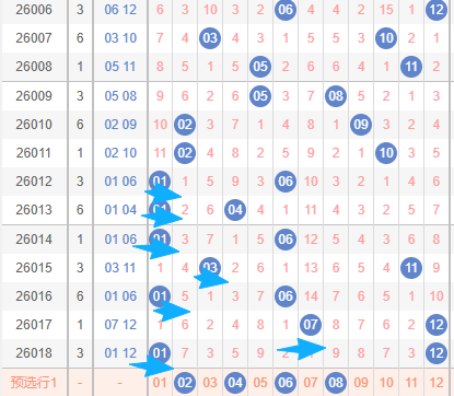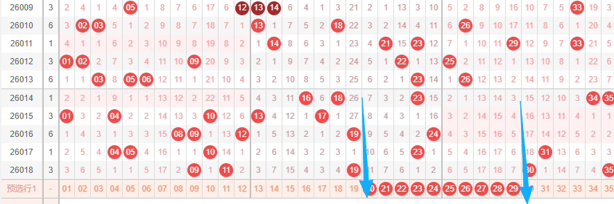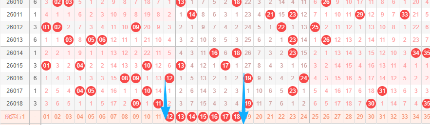 上图是体彩大乐透后区开奖号码走势分布图,我在上面标注出来的蓝色小箭头表示的就是左边这个数字最近连续几期开出的都是奇数数字,连续7期开出的都是奇数数字,那么本期左边这个数字我看出偶数数字,假设出偶数数字的话,那么第一个数字范围就是02 04 06 08。