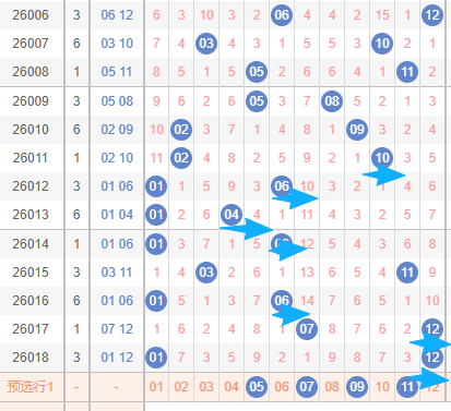 上图是体彩大乐透后区开奖号码走势分布图,我在上面标注出来的蓝色小箭头表示的就是右边这个数字最近几开出的都是偶数数字,最近8期开出了7期偶数数字一个奇数数字,那么本期可以看第二个数字出奇数数字,假设出奇数数字的话,那么范围就是05 07 09 11;