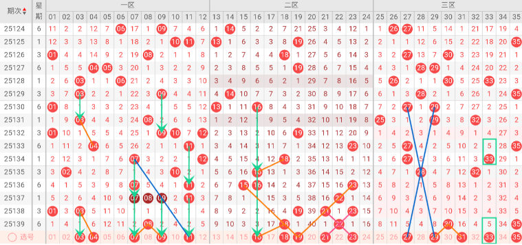 三区(25-35)分析:上期该区开出号码 30 35,近10期占比26%,与上期相比无变化。本期无三斜连号趋势,隔码斜连走势:27 29。三区经历了连续三期空开后,上期强势反弹开出2码,标志着连续3期空开后的~。首次回补即出2码,显示~。这种长期沉寂后爆发的形态,通常具有~。历史数据表明,此类长期断区后的回补~,继续出号1-3码的概率依然很高,本期看好维持2码。该区近期~,且~,易形成~,可能尝试~。推荐关注号码:27、29、31、33、35。