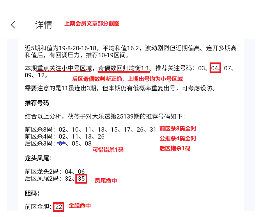 上期前区杀8码全对,公推前区杀4码全对,后区错杀1码。会员文章中金胆命中,凤尾命中,重号、连号均判断正确。
