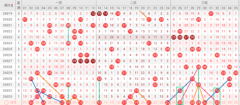 三区(25-35)分析:上期该区没有开出号码,近10期占比32%,与上期相比-8%。本期无三斜连号趋势,隔码斜连走势30。