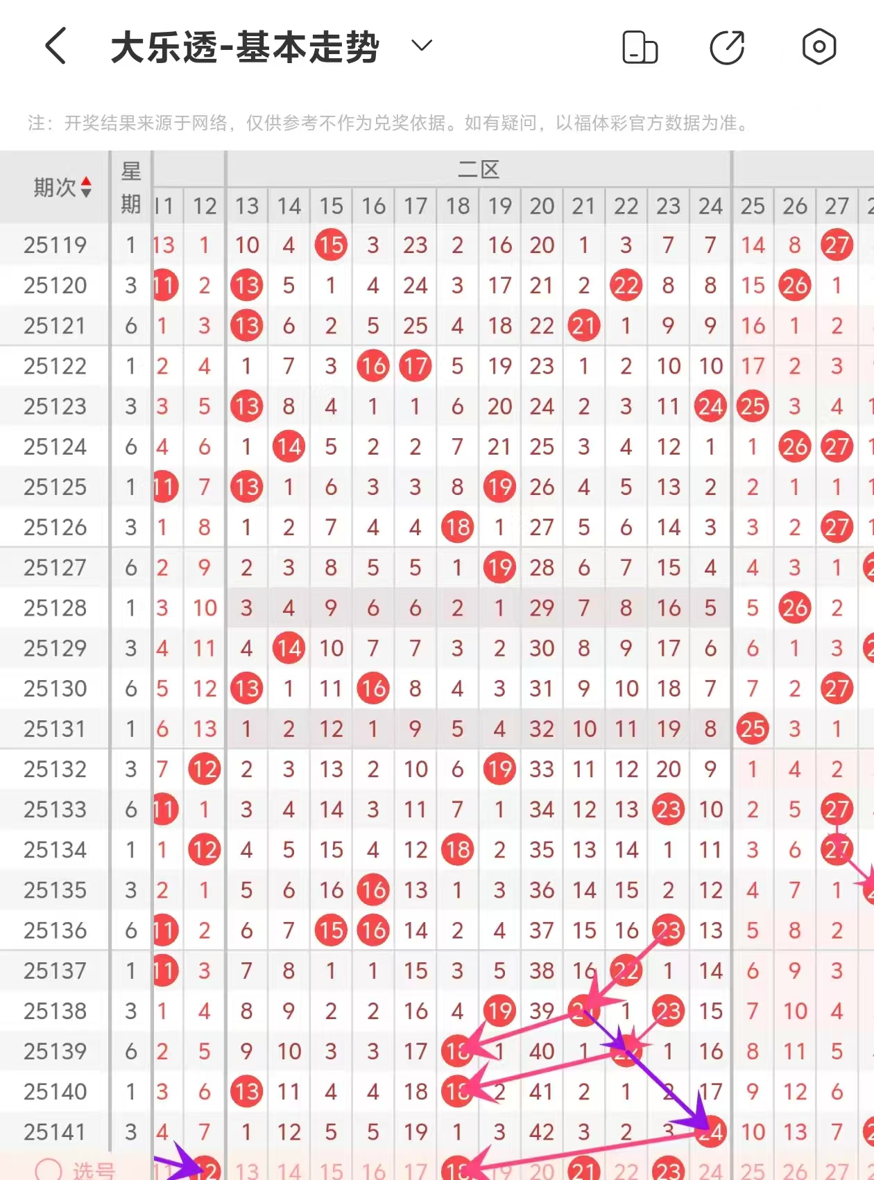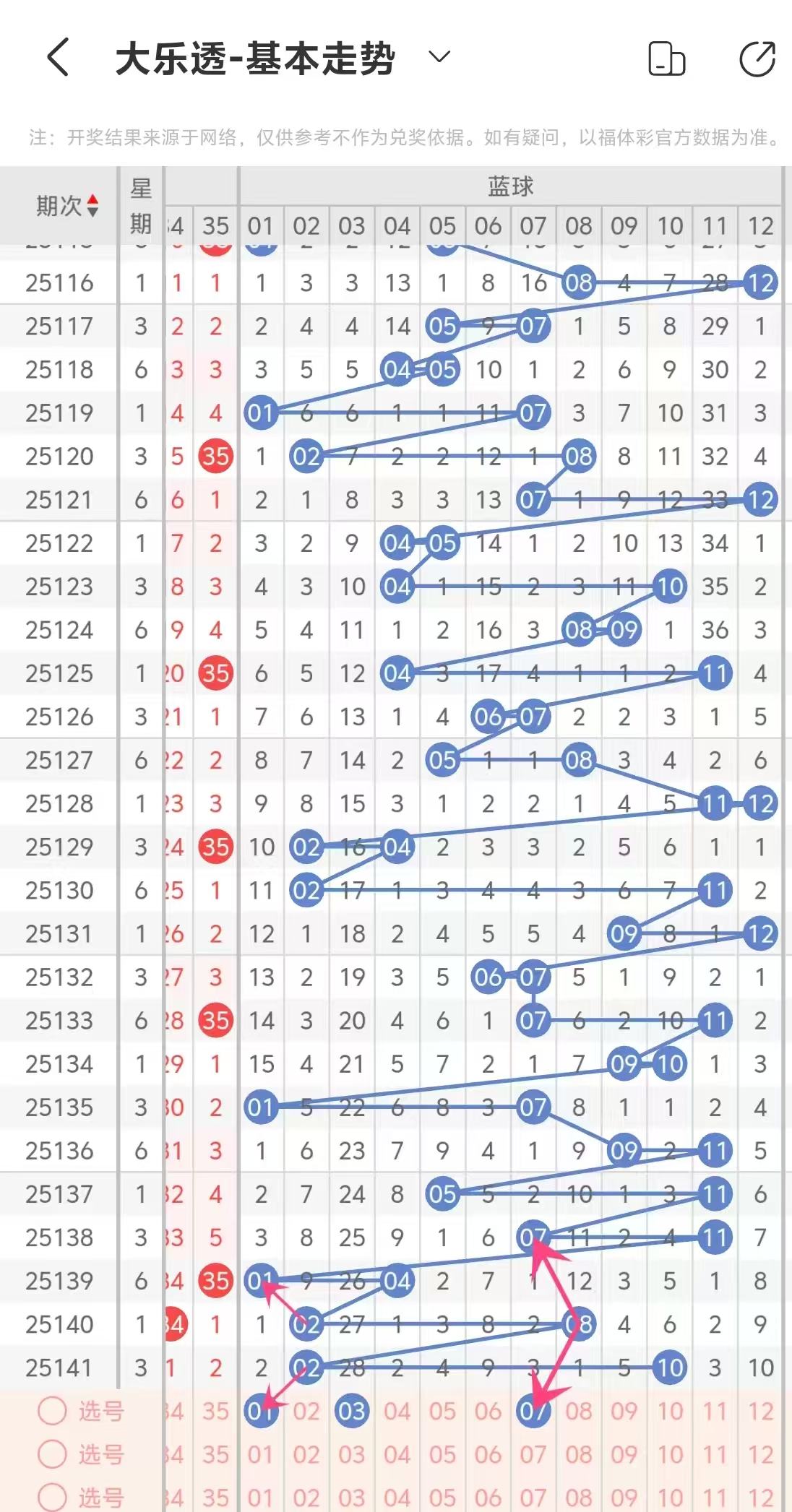 免责声明:以上内容纯属个人推荐大底数据,无主动建议彩民全打复式(全打复式者,后果自负),本人仅提倡彩民从以上大底数据中选出5+2单式打一注,打个两元参与娱乐就行了,本人不是神,有过小红有过大黑(一个号都不来),研究走势图分析画图仅属本人爱好,图还画的挺好看,中不中用本人不知,如图中中了一两个的话纯属巧合,所以请您参考好数据,慎重投注选号,避免伤身破财,谢谢大家观看以上内容