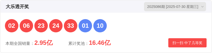 超级大乐透25086期开奖结果02 06 23 24 33 + 01 10,三区比2:2:1,七区比1:1:0:0:2:0:1,五区比2:0:0:2:1,蓝球号码奇偶为奇、偶。