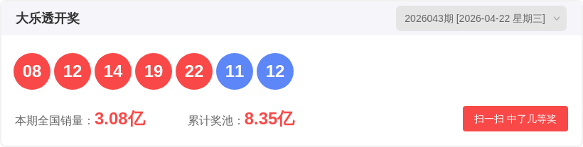 超级大乐透26043期开奖结果08 12 14 19 22 + 11 12,012路比1:2:2,跨度14,蓝球号码奇偶为奇、偶、大小为大、大。