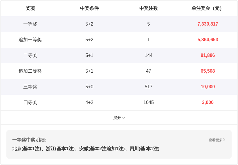 超级大乐透26009期开奖结果05 12 13 14 33 + 05 08,七区比1:0:3:0:0:0:1,和值77,和值尾7,蓝球号码质合为质、合。