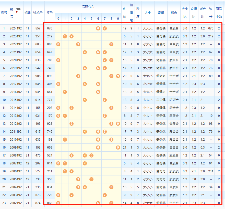 这23期大小比2:1出靠前,这期可以考虑选2:1。奇偶1:2出靠前,奇偶比可以考虑1:2