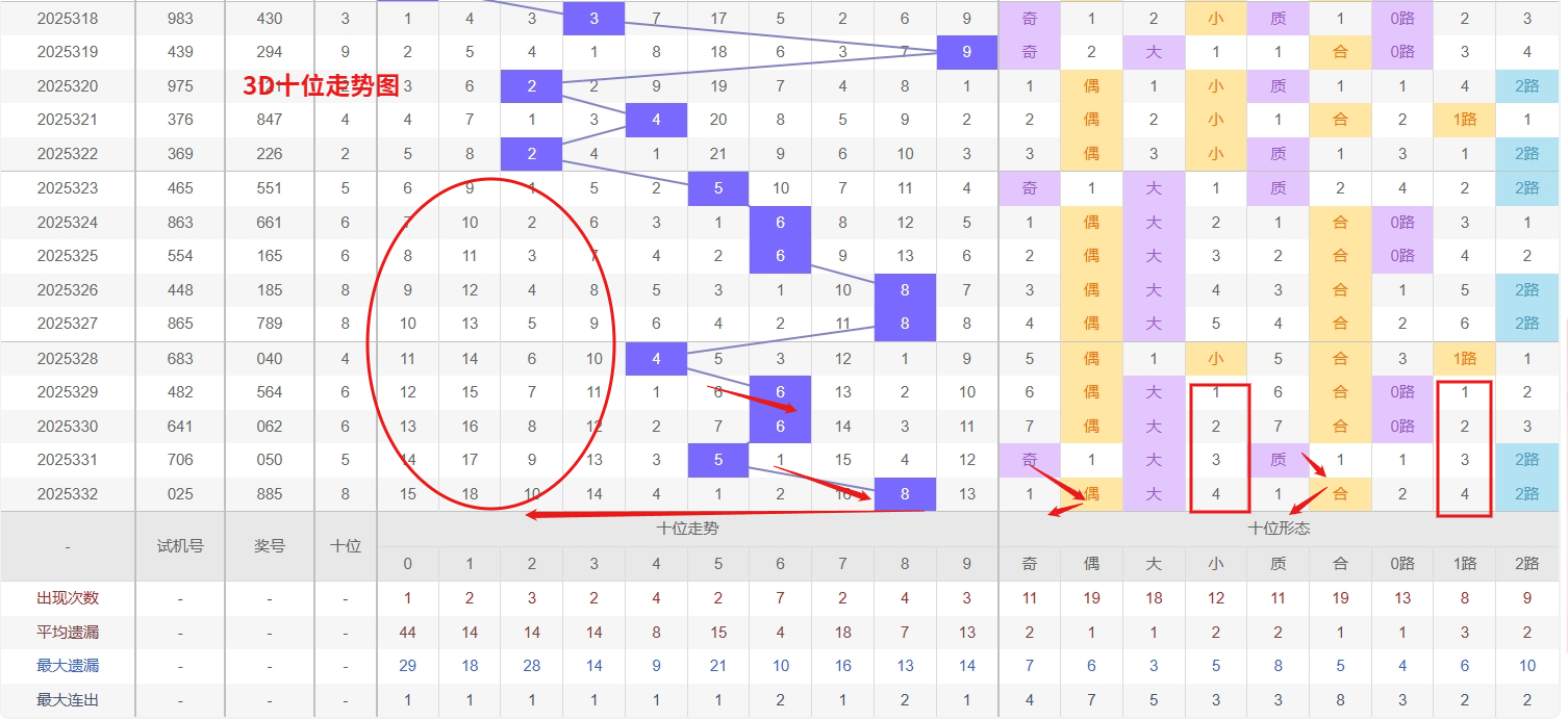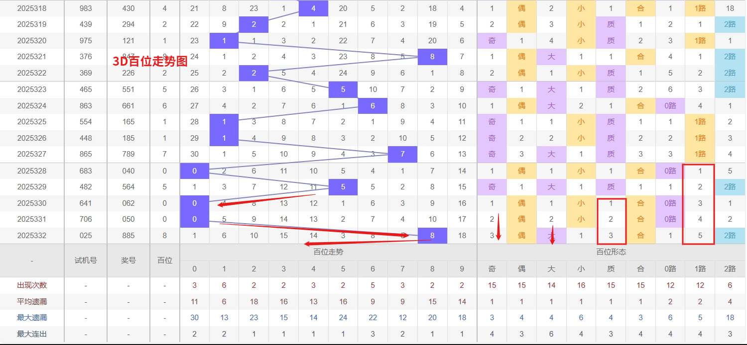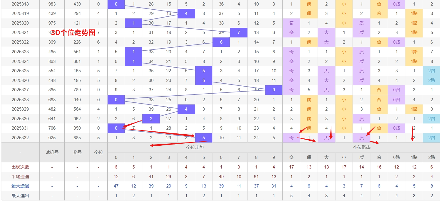 福彩3D个位分析:第2025332期个位开出号码5属于大奇数中端,从以上个位走势图中可以看出近100期的大小比约为47:53奇偶比约为54:46大小奇偶数据上有点差异有需求但不是太明显,不太好看这时就要借助连线走势和遗漏数据来帮助我们缩水号码。上期个位落号“5”大奇数2路号码球,号码开出了5振幅,连续多期的小振必被大振幅取代幅符合我们的预期,那么本期我们在个位考虑振幅走势走前依然要转变思路考虑大振幅,具体考虑(1-5)个振幅是我们主要的方向,那么在对个位落号情况进行系统的分析时我们可以明显的看到个位号码走势呈现大范围震荡,尤其是在号码的落位特点上表现的尤为突出,那么本期我们在个位分析时就要注意号码的风险,避免出现踏空。3D个位走势来看,号码3和8已遗漏多期,明显低于其理论出现频率,形成冷态。根据概率均衡规律,冷号往往在达到一定遗漏极值后出现回补,因此近期需密切关注3和8的反弹信号,尤其可结合形态搭配进行防范。与此同时,号码0近期表现活跃,频繁开出呈现热态,这种热度惯性短期难以迅速冷却,即使间隔也需防范其再次出现。整体而言,个位呈现“冷热分明”的格局,在关注冷号回补机会的同时,对热号0的持续表现保持警惕,因此福彩3D第2025333期个位看好02368。本文由一起彩钱是生命动力所著,请勿转载