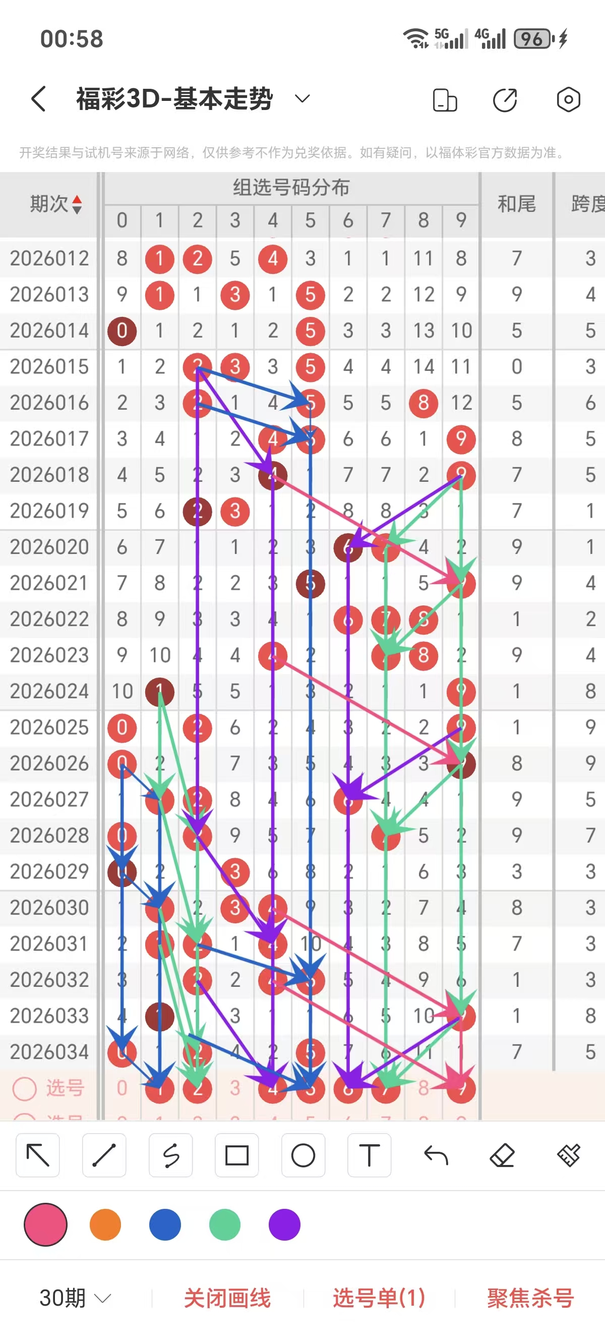 跨度通常情况下在五期之内重复一个跨度的概率很高,近五期重复了3的跨度,近五期跨度为3/3/3/8/5,近期02路的跨度较热,上期是2路的跨度,本期要侧重跨度以3/5/8跨为主的号码组合。可以从跨度方面选择相应的双胆码组合,双胆码的选取要根据近期和历史的走势进一步的分析选取。