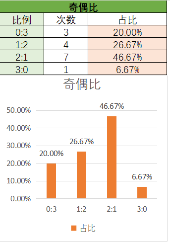 上期奇偶比为0:3,其中0:3占比变大,2:1占比变小。近15期内2:1优势最好,其次是1:2,然后是0:3,最后是3:0。上期开了0:3奇偶比,本期看好2:1奇偶比的开出,其次是1:2。