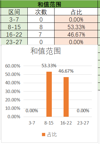 上期和值是16,处在16~22之间,其中16~22占比变大,8~15占比变小。目前是8~15占比最优,其次是16~22。本期看好和值在8~15之间,其次是16~22。