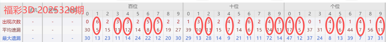 2025327期开奖号码789,我们可以看出近30期百位7出现5次,十位8出现4次,个位9出现4次。