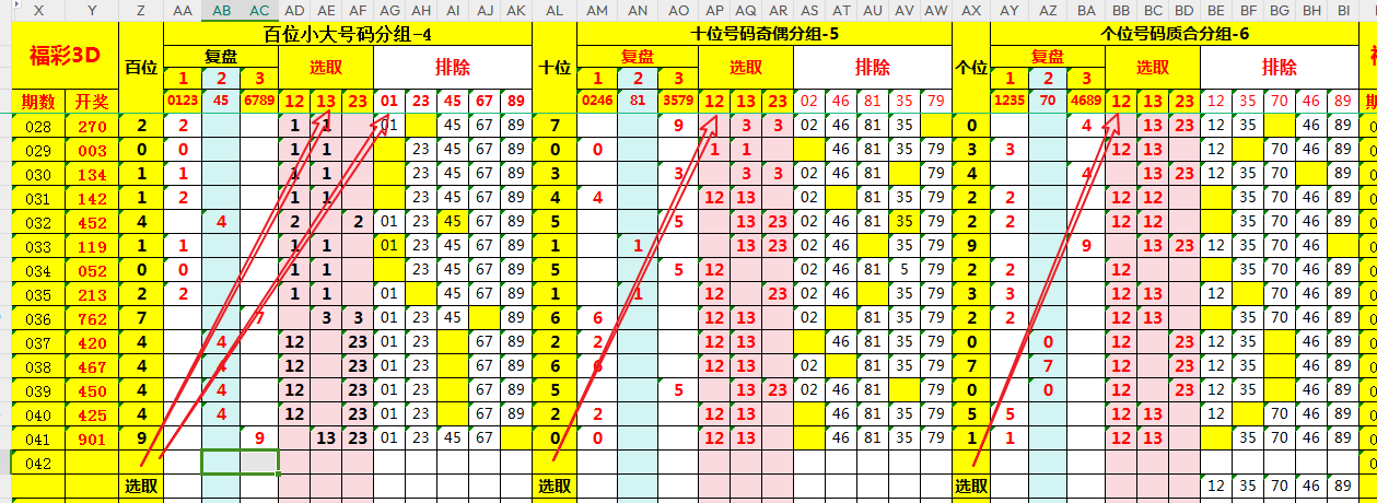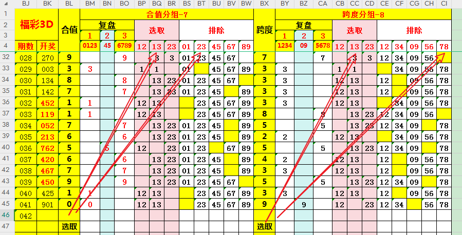 福彩3D和值范围为0–27,和值尾(合值)与跨度范围为0–9的十个数值吻合。分别将合值及跨度值进行分组即;分别划分为“复盘、选取、排除”列。复盘近期数据如下: