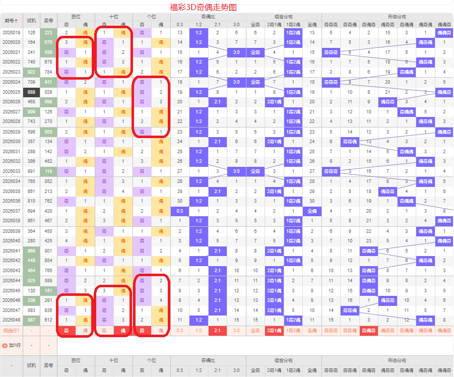 上期奇偶比是1:2,两偶的号码组合方式,从近五期的奇偶数出现情况看,奇数出现9次,偶数出现6次,奇数号码出现较多,本期侧重两奇的号码组合,侧重奇偶奇或奇偶偶的号码组合方式,根据奇偶形态做五码定位13579/02468/13579或13579/02468/02468