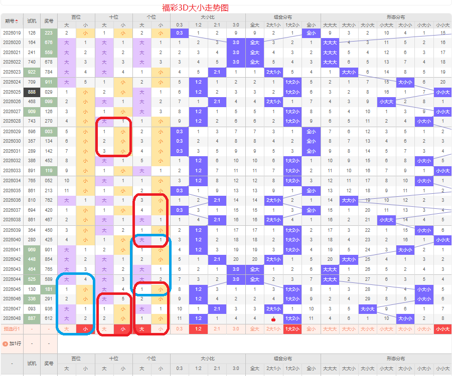 上期大小比为1:2,两小的号码组合方式,从近五期出现情况看,大号码出现8次,小号码出现7次,大小号码出现较平均,本期侧重两小的号码组合,本期百位侧重小号码,十位侧重小号码,个位要侧重看大,侧重小小大或者小大大的号码组合,根据大小做五码定位01234/01234/56789或01234/56789/56789