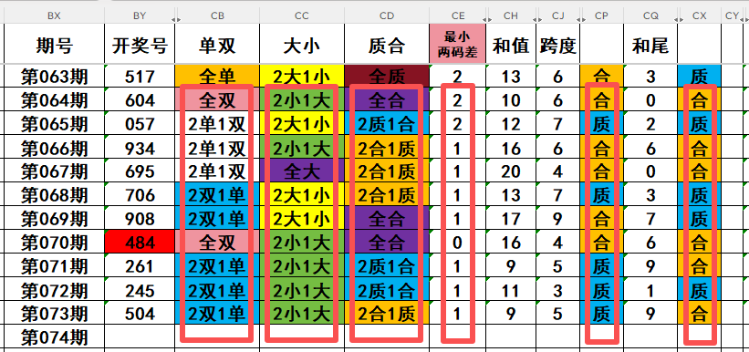 4,最近10天当中,最小两码差0开出1次,最小两码差1开出7次,最小两码差2开出2次,最小两码差3开出0次,