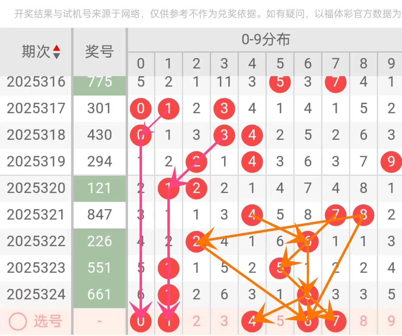 “0”在近30期中出现11次,虽为低频数字,但近期有明显复苏迹象:最近10期内出现4次,且多次出现在位置一(如第2025317期“3,0,1”)和位置三(如第2025311期“6,4,0”)中,形成“夹心”或“收尾”结构。从历史数据看,“0”常在连续遗漏4-5期后迎来爆发,当前已遗漏3期,正处回补窗口。作为“海青胆”,它象征“潜流涌动”,常在冷号区间中率先突破,带动“3”“5”“9”等数字活跃,适合作为防守型胆码,尤其在组六形态中易与“1”“6”形成互补组合。