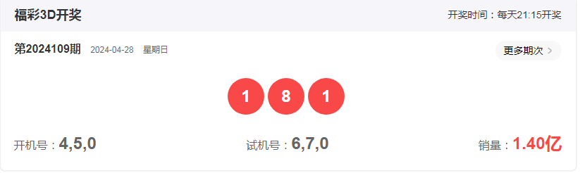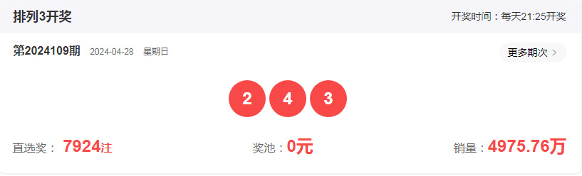 排列三第109期开奖回顾:开奖号码:243,形态:组六