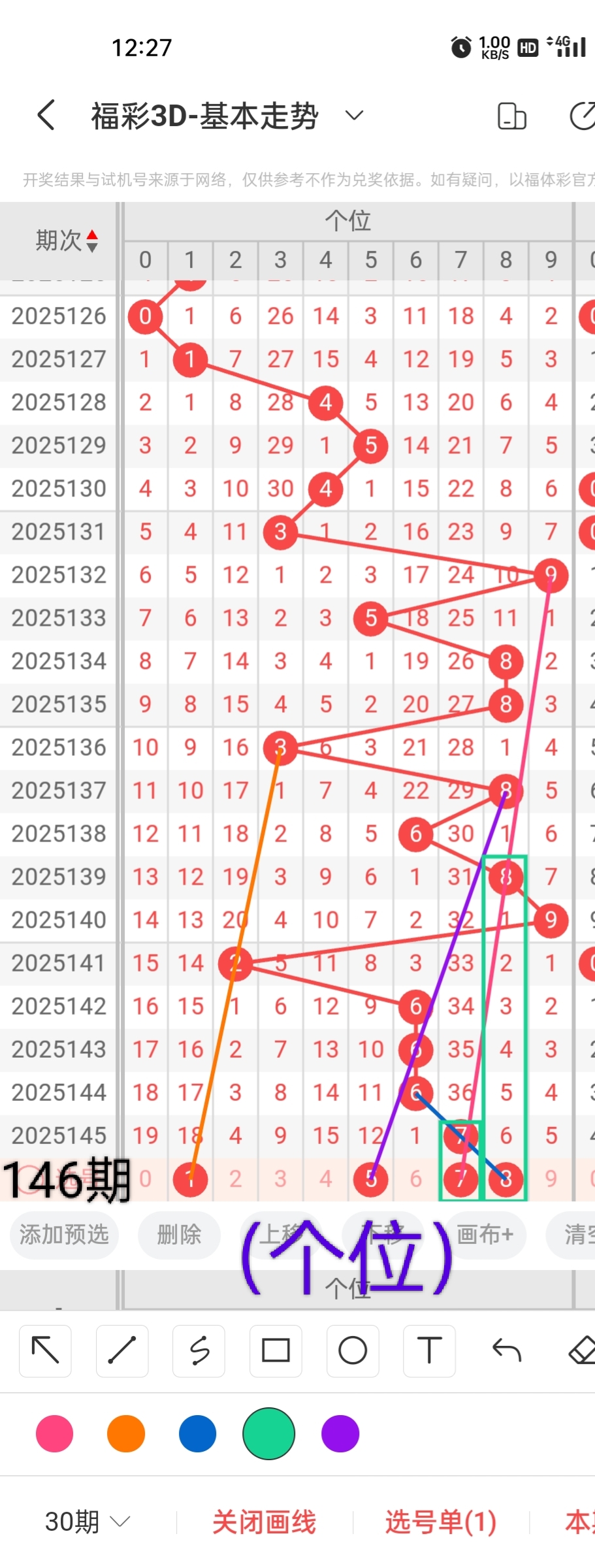 首先,小梁为了感谢各位老板的关注和打赏,特提供一个杀个位的小技巧,同尾杀号法,准确率相当高。根据同尾杀号法,得知本期杀个位6。其次,我们根据图中画线的思路可以看出,遗落18期未出的号码1与前几期开出的号码呈斜三连的走位,跨度为6;遗落12期未出的号码5与前几期开出的号码呈斜三连的走势,跨度为2;号码7与前几期开出的号码呈斜三连的走势且呈直连回补的走位,跨度为0;号码8与前几期开出号码呈隔六期回补的走位且呈斜三连的走势,跨度为1。综上所述,小梁依据图中画线思路预测个位开出的号码为1、5、7、8。