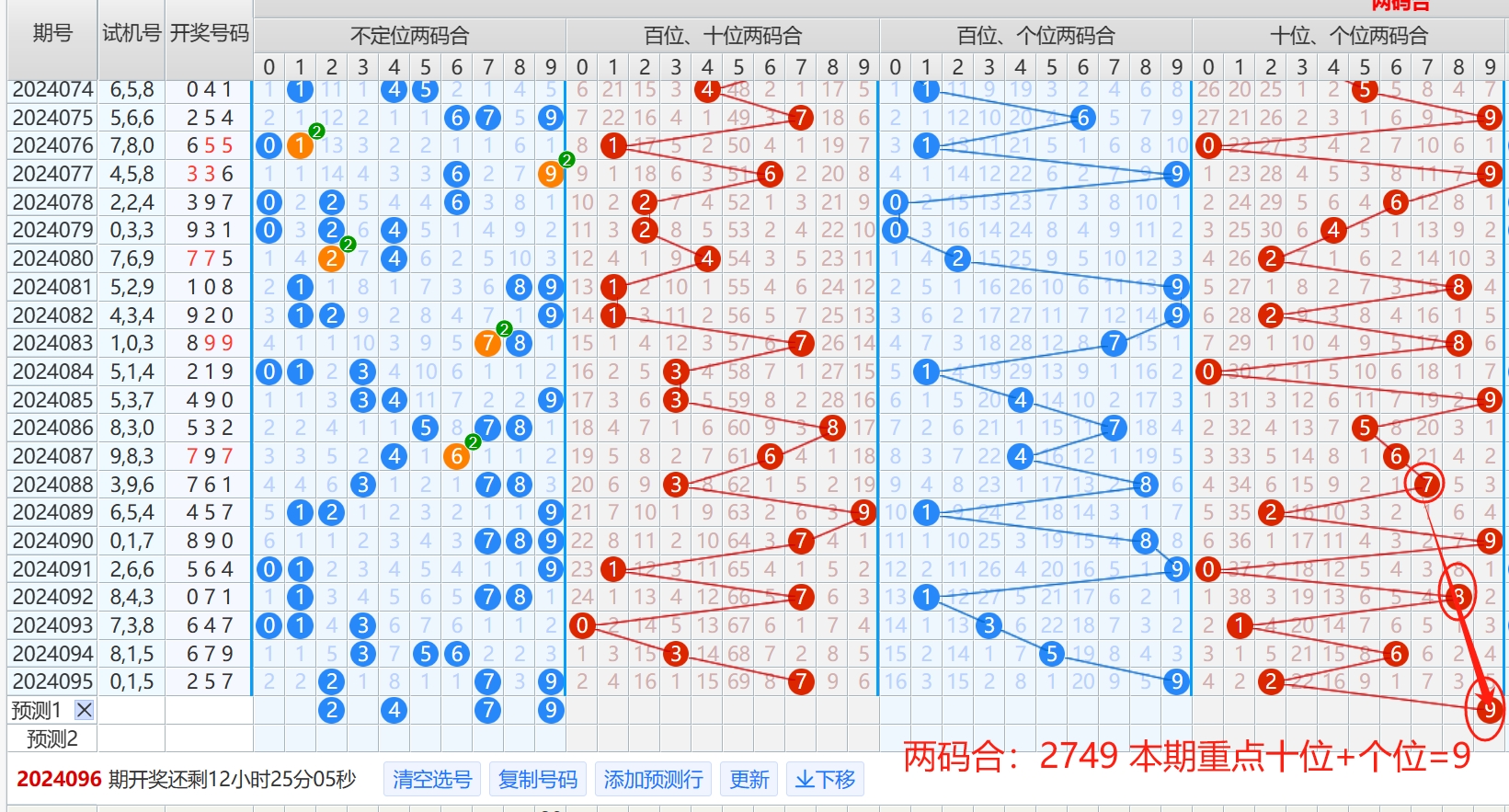 第二步:画出任意两码和走势图(重点看坐号和斜连线)