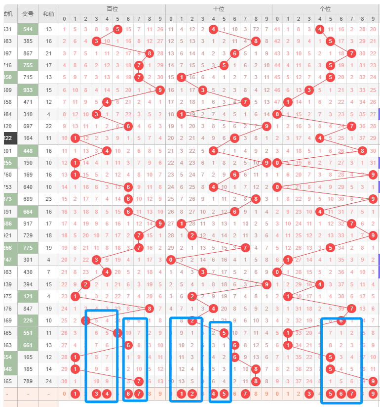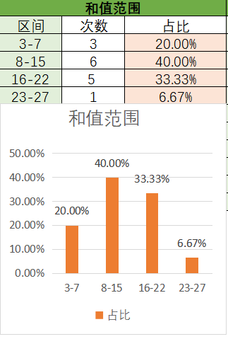 上期和值是24,处在23~27之间,各个类型占比没有变化。目前是8~15的和值占比是最多的,优势是最好的,其次是16~22之间,然后是3~7,最后是23~27。本期看好和值在8~15之间,其次是16~22。