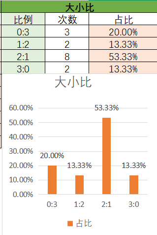 上期大小比为3:0,各类型占比没有变化。可以看到近15期内2:1优势最好的,其次是0:3,最后是1:2和3:0。本期看好2:1开出,其次是1:2。