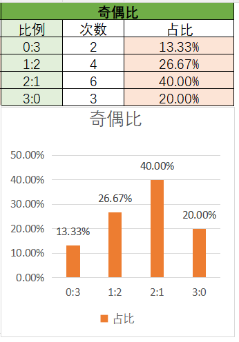 上期奇偶比为2:1,其中2:1占比变大,1:2占比变小。近15期内1:2优势最大,次之是2:1,然后是3:0,最后是0:3。上期开了2:1奇偶比,本期还是看好2:1奇偶比的开出,其次是1:2。
