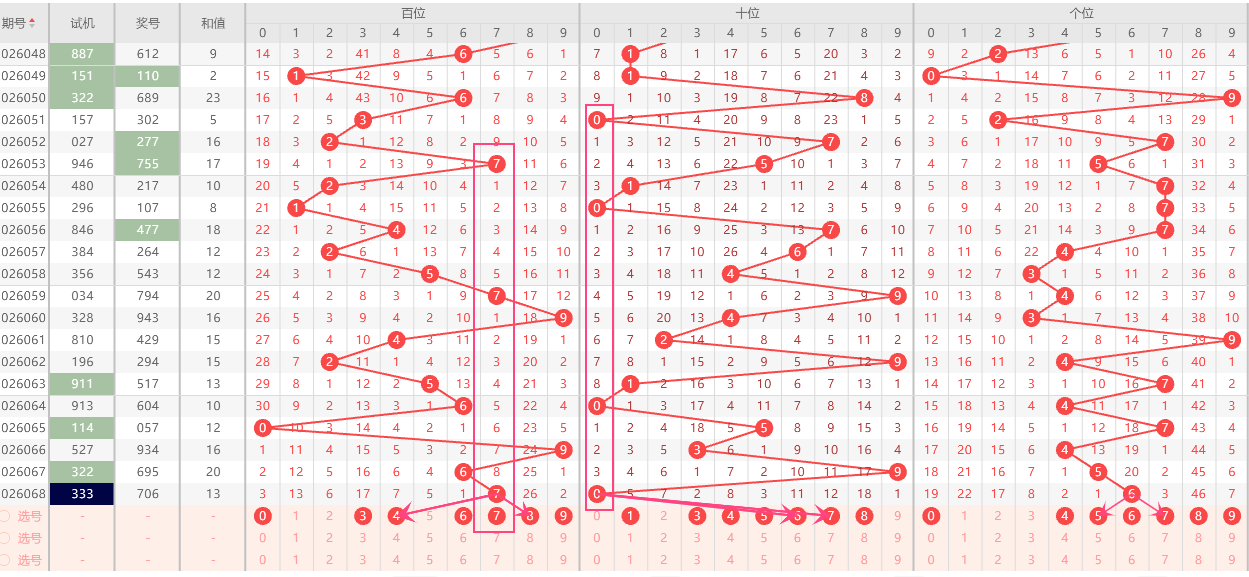 百位上期开出号码7数、百位近5期开出号码为:6-0-9-6-7从近5期看64期遗漏为1365期遗漏为3066期遗漏为567期遗漏为268期遗漏为8,本期号码关注遗漏号码48,大小数走势为大小大大大大号码走热,本期继续关注数开出,奇偶走势为偶偶奇偶奇。偶数形态走热注意奇数回暖本期百位推荐:0-3-4-6-7-8-9