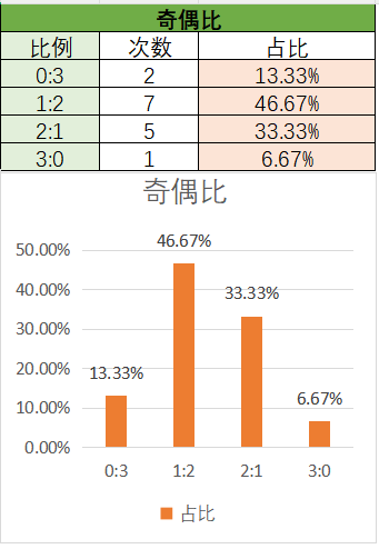 上期奇偶比为1:2,其中1:2占比变大,2:1占比变小。近15期内1:2,2:1优势最好,其次是0:3,最后是3:0。上期开了1:2奇偶比,本期看好2:1奇偶比的开出,其次是1:2。