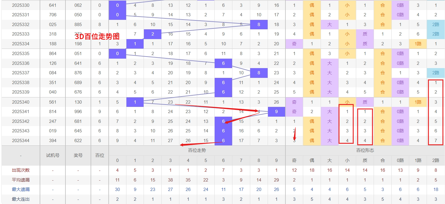 福彩3D百位分析:第2025344期百位开出号码6属于大偶数,从上面百位走势图上可以看出近100期大小比约为55:45奇偶比约为52:48。近期数据还是比较极端的符合文章开头介绍的求均衡规律非等量现象。但这种均衡不会持续最终会被偏态运行打破,然后循环往复。但短期内大小相差0点,小数过热大数有回补需求本期个人认为走大数的概率更高。上期百位落号“6”号球,在百位号码开出0路号码6后向小数方向走出0个振幅。那么通过分析上期百位落位号码分析,号码走出0个振幅,号码走为大偶数,开出0路号码6。通过对百位落号趋势来分析,百位号码落位中端,通过对近10期的走势来看百位号码大小交替频繁走3期大数又走2小数,近期3D百位走势观察,数字0和1呈现明显的热态,频繁开出形成短期强势,这种热度往往具有一定的惯性,短期内仍有持续表现的可能。然而,热号频繁出现的同时也需警惕其热度衰减的转折点。相比之下,百位数字3目前已处于较冷的遗漏状态,从概率均衡与冷热转换的规律来看,冷号不会永远沉寂,其回补动能正在逐渐累积。尤其在当前热点集中于0和1的格局下,数字3作为冷号,其突然解冻回补的风险值得重点防范。们在百位关注的重点在01379这5个号码球上,百位号码近期奇偶切换频繁,6号球码属于0路号码偶数,现偶数开出过多有向奇数的趋势。所以福彩3D第2025345期百位看好01379