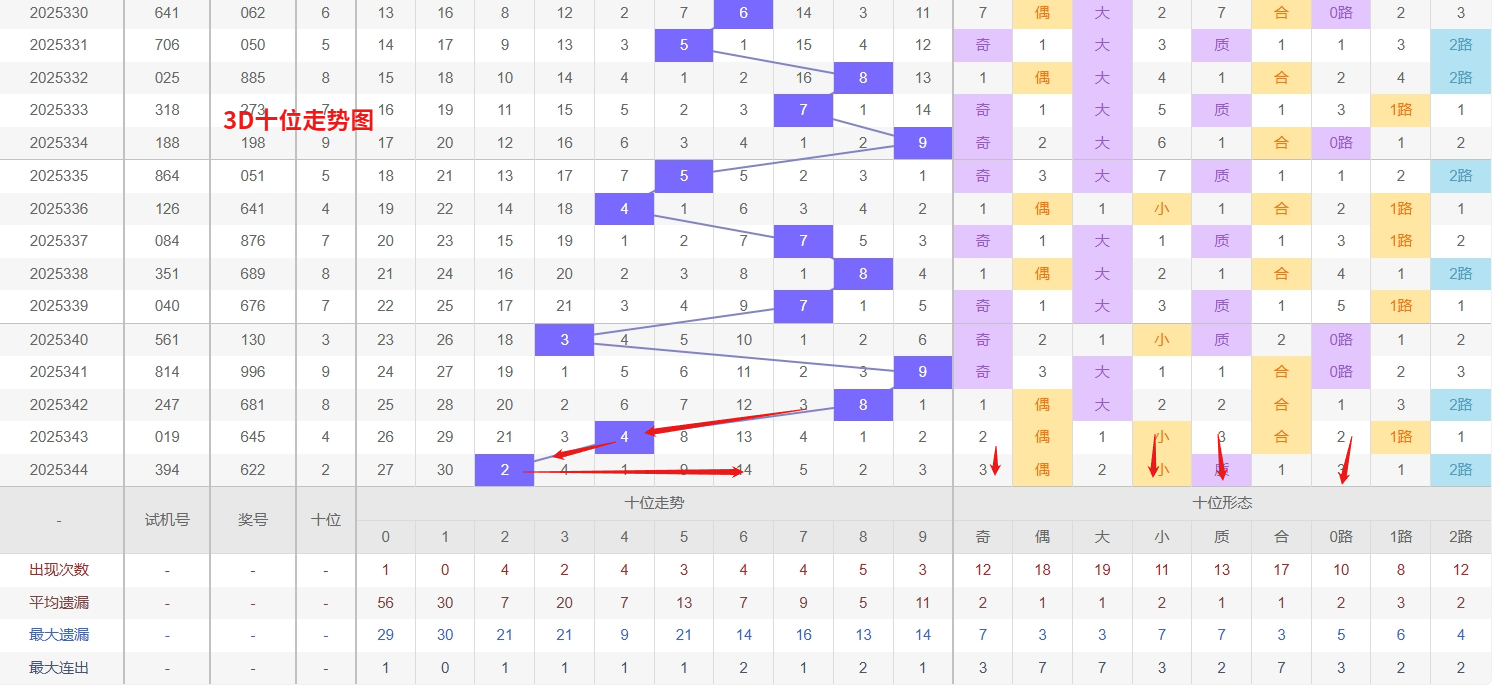 福彩3D十位分析:第2025344期十位开出号码2属小偶数号码前端。以历史100期数据为例十位奇偶比约为47比53,大小比约为55比45近期大小相差2点,根据求均衡的规律开出小数的概率比大数高一点。上期我们分析奇数经过连续回补后有走偶数的可能,开出奖号2小偶数符合我们的预期。近期3D十位走势分析,数字0与1已分别遗漏29期和30期,进入深度冷态区间。根据概率均衡与遗漏追踪规律,长期未出的冷号其理论回补压力正逐渐增大,尤其当遗漏值逼近或超过历史极值附近时,反弹开出的可能性显著提升,近期需密切关注其回补信号的出现。另一方面,数字6则呈现明确的热态,短期内频繁开出形成强势,热号惯性可能使其仍有持续表现。所以福彩3D第2025345期十位推荐01569。