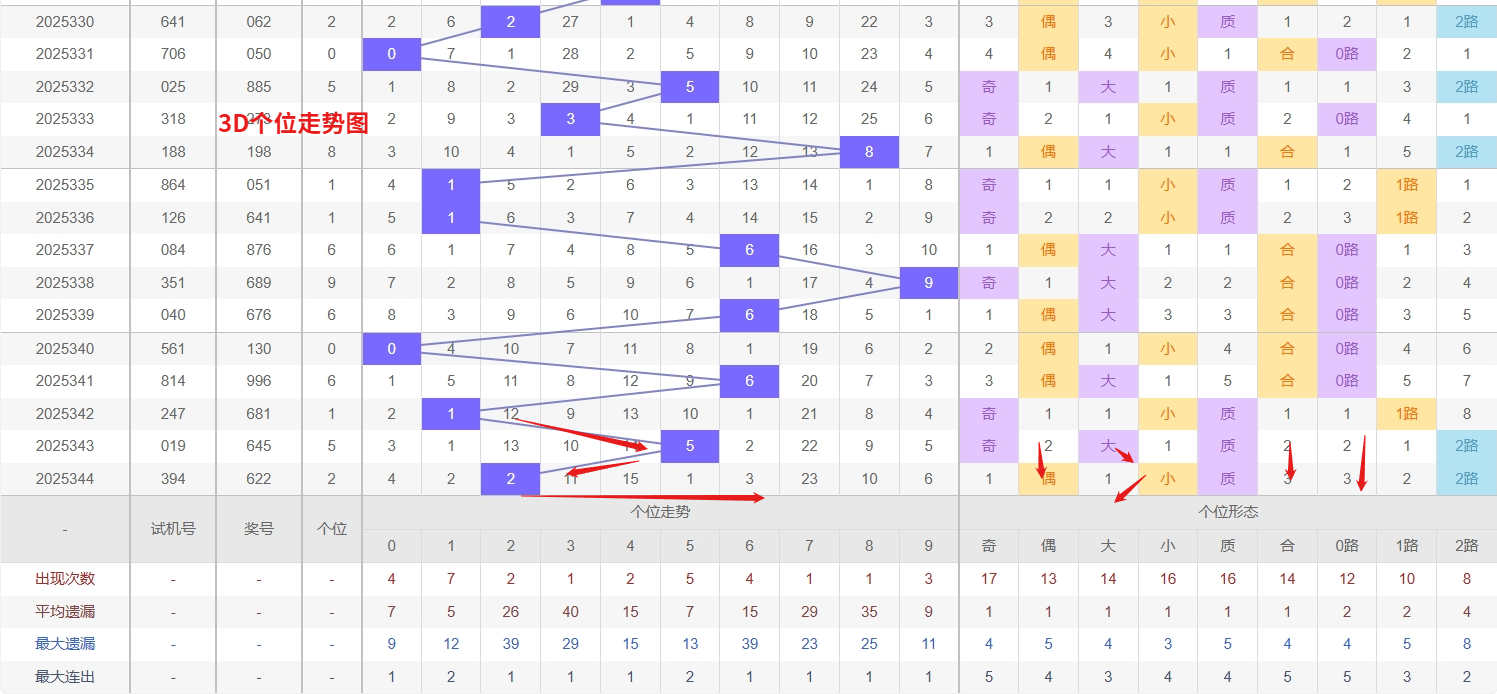 福彩3D个位分析:第2025344期个位开出号码2于小偶数前端,从以上个位走势图中可以看出近100期的大小比约为47:53奇偶比约为54:46大小奇偶数据上有点差异有需求但不是太明显,不太好看这时就要借助连线走势和遗漏数据来帮助我们缩水号码。上期个位落号“2”小偶数2路号码球,号码开出了3振幅,连续多期的大振必被小振幅取代幅符合我们的预期,那么本期我们在个位考虑振幅走势走前依然要转变思路考虑大振幅,具体考虑(1-5)个振幅是我们主要的方向,那么在对个位落号情况进行系统的分析时我们可以明显的看到个位号码走势呈现大范围震荡,尤其是在号码的落位特点上表现的尤为突出,那么本期我们在个位分析时就要注意号码的风险,避免出现踏空。从3D个位近期走势来看,数字7和8已持续遗漏进入冷态区间,尤其当遗漏期数积累至一定程度后,其回补的潜在压力逐步增大,从冷热均衡的角度分析,这类冷号往往会在市场关注度较低时悄然反弹,值得后续保持关注。另一方面,数字6呈现明确的热号特征,短期内频繁开出形成强势轨迹,热态惯性可能使其仍有延续表现。因此福彩3D第2025345期个位看好24678。