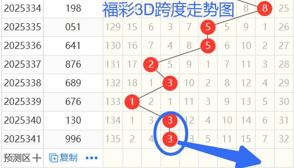 2)我们来看跨度;还是以337期——341期为例,如图依次是23133跨度,按照路数转换关系来看,那么跨度我们暂定147258跨 ,本期个人比较看好8 7 5 9跨。