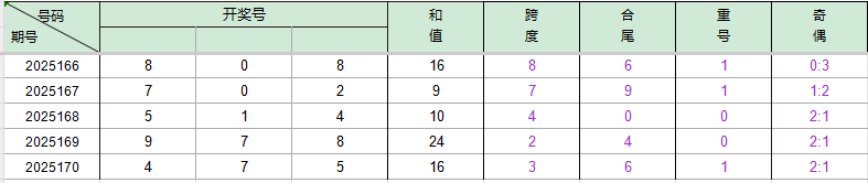 2025166期开奖号码808,我们可以看出近30期百位8出现3次(较167期减1),十位0出现5次,个位8出现4次(较167期减1)。