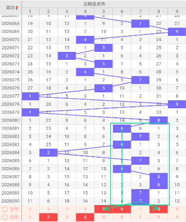 上期跨度7,这是一个中大跨度。近10期跨度在6-8之间出现的频率较高,大跨走势明显。但连续多期大跨后,往往会有收缩需求。本期判断跨度可能回归到4-6这个常规区间,这意味着开奖号码的分布会更加集中,首尾号码的差距不会拉得太大,重点关注跨度5、6、8。同时防守跨度2、4。