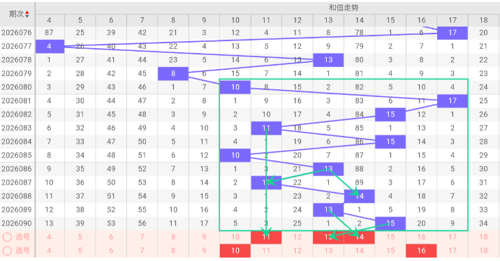 上期和值15,处于10-18这个高频区间的上部,延续了近期和值在中高位徘徊的特点。回顾近10期,和值在11-17之间波动频繁,呈现出明显的扎堆现象。根据均值回归规律,本期和值大概率会继续在中区10-18徘徊,但考虑到上期两大一小的组合,本期和值有小幅回落的可能。本期和值可能在10-16区间,重点关注11、13、14。