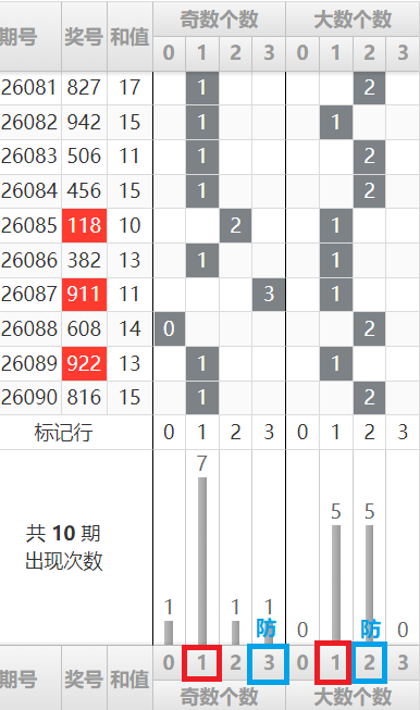 上期大小比2:1,大小数均衡优势。近10期大数出现15次,大小走势均衡。但结合和值可能回落的判断,本期小数的占比有望提升。本期看好2小1大防2大1小。