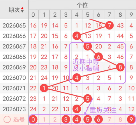 近7期(067~073)开奖号个位号码球分别为5、6、8、4、1、5、4,开奖号与上一期走出的振幅分别为1、1、2、4、3、4、1。067期走出5号中大小数号码球,走出“1”的小幅度,068期走出6号中大数号码球,走出“1”的小幅度,069期走出8号大数号码球,走出“2”的小幅度,070期走出4号中小数号码球,走出“4”的中小幅度,071期走出1号小数号码球,走出“3”的中小幅度,072期走出5号中大数号码球,走出“4”的中小幅度,073期走出4号中小数号码球,走出“1”的小幅度;从近期振幅大小的走势及大小走势来看,中大振幅走在4~5之间较为适宜,中小振幅走在0~2之间较为适宜;结合走势图的整体及大小走势分析,本期个位应重点关注号码球为0、3、4、5、6、9。