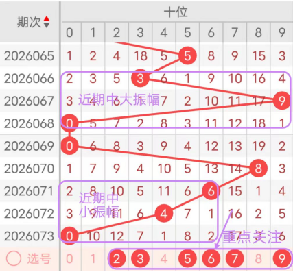 近7期(067~073)开奖号十位号码球分别为9、0、0、8、6、4、0,开奖号与上一期走出的振幅分别为6、9、0、8、2、2、4。067期走出9号大数号码球,走出“6”的中大幅度,068期走出0号小数号码球,走出“9”的大幅度,069期走出0号小数号码球,走出“0”的小幅度,070期走出8号大数号码球,走出“8”的大幅度,071期走出6号中大数号码球,走出“2”的小幅度,072期走出4号中小数号码球,走出“2”的小幅度,073期走出0号小数号码球,走出“4”的中小幅度;从振幅大小及走势图的整体对应来看,中大振幅走在5~9之间较为适宜,中小振幅走在2~3之间较为适宜;结合走势图的上下对应及振幅大小分析,本期十位应重点关注号码球为2、3、5、6、7、9。