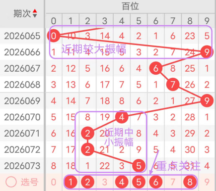 近7期(067~073)开奖号百位号码球分别为6、7、9、4、2、2、5,开奖号与上一期走出的振幅分别为3、1、2、5、2、0、3。067期走出6号中大数号码球,走出“3”的中小幅度,068期走出7号大数号码球,走出“1”的小幅度,069期走出9号大数号码球,走出“2”的小幅度,070期走出4号中小数号码球,走出“5”的中大幅度,071期走出2号小数号码球,走出“2”的小幅度,072期走出2号小数号码球,走出“0”的小幅度,073期走出5号中大数号码球,走出“3”的中小幅度;从振幅大小及走势图的整体形势,中大幅度走在3~4之间较为适宜,中小幅度走在0~1之间较为适宜;结合走势图的整体及大小走势分析,本期百位需重点关注号码球为1、2、4、5、6、8。