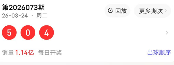2026073期开奖号码为504,奇偶值为1奇2偶;大小值为1大2小;012路走势为012路;跨度为5跨;和值9点;组六形态。
