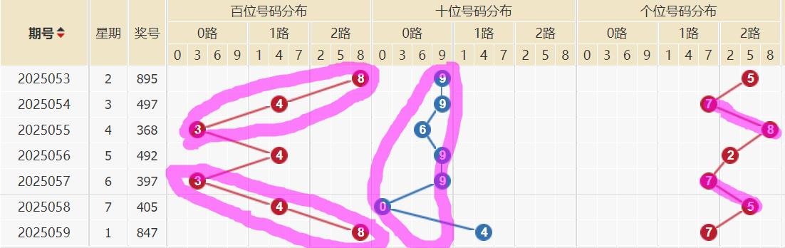 百位主导开奖号码的整体格局,其冷热温波动如同江河改道,冲刷出概率的河床。如图所示,近七期开奖号码中百位共开出热号5次,温号2次,冷号0次,可以看出,热号和温号趋势明显。现在让我们聆听一下余数的三重奏,百位012路走势分别出现0路2次;1路3次;2路2次,就走势图来看,近期百位走势分布均匀,基于动态平衡,本期开奖号码多半会在0路和1路产生。