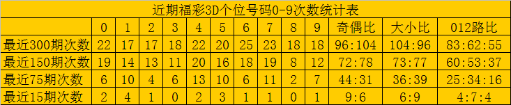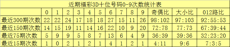 最近15期奖号由冷到热表现为:9→0次,3、4、6、8→1次,0、2、5、7→2次,1→3次,奖号奇偶比为8:7,大小比为6:9,012路比为4:6:5。