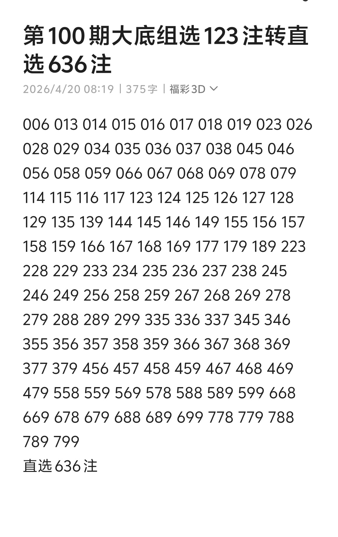 黄先森吖福彩3D2026100期当期核心走势分析+636注大底推荐