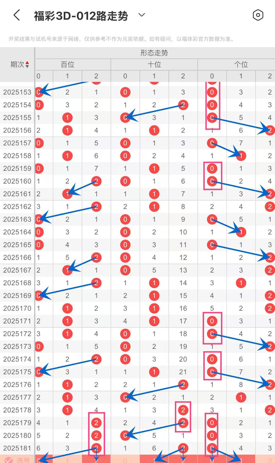 福彩3D中,012路是把0-9这10个数字按除3余数划分,0、3、6、9为0路,1、4、7为1路,2、5、8为2路。以下是对近30期百、十、个位012路形态走势分析