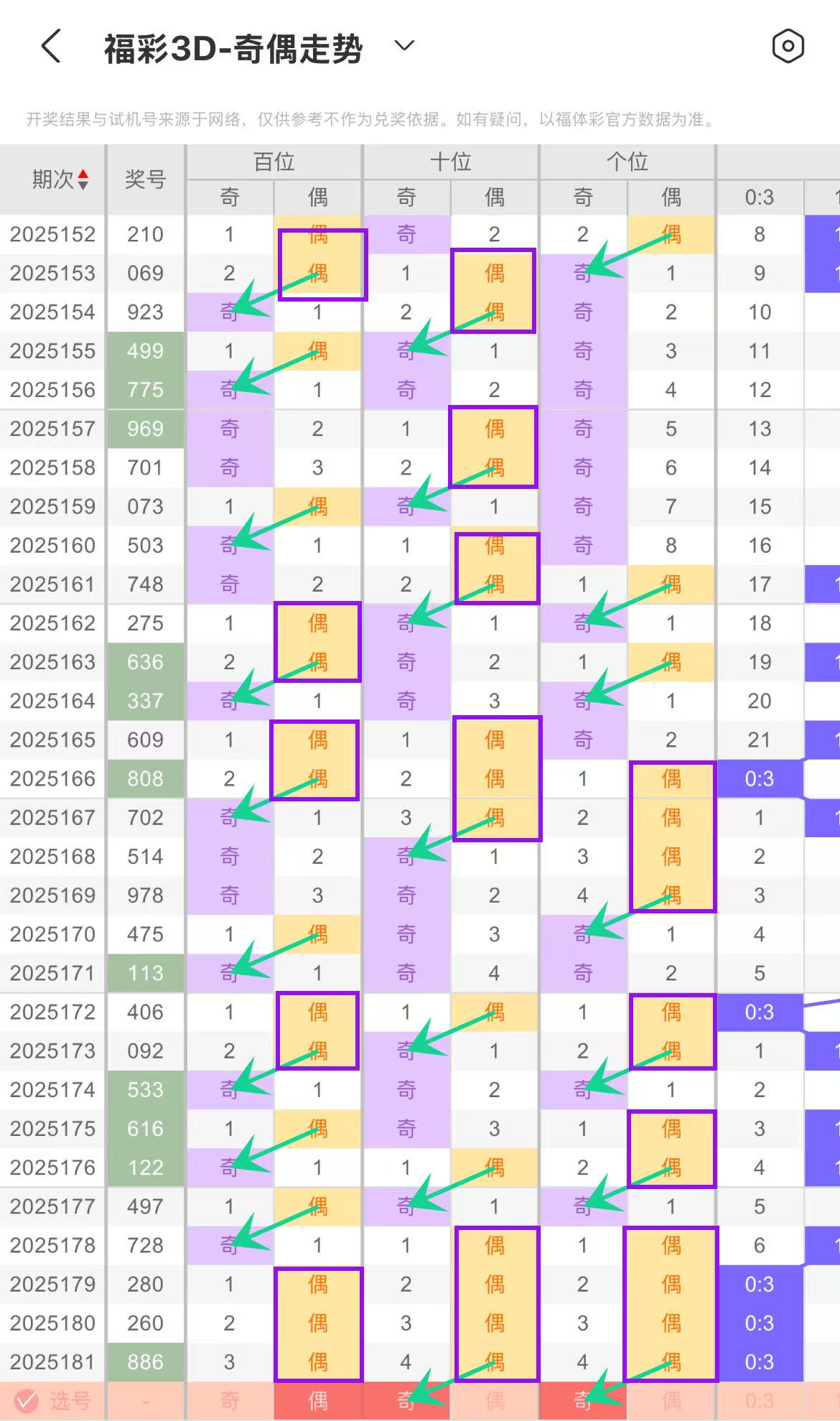 根据上期开出偶数连下分析,十位奇数出号较为稳定,是基础出号形态,偶爾会有连下情况。偶数多以回补形式介入,在奇数持续出号后,偶数回补概率增加。需留意奇数连出周期,把握偶数回补时机,捕捉十位奇偶转换信号,本期参考回补奇数(13579)